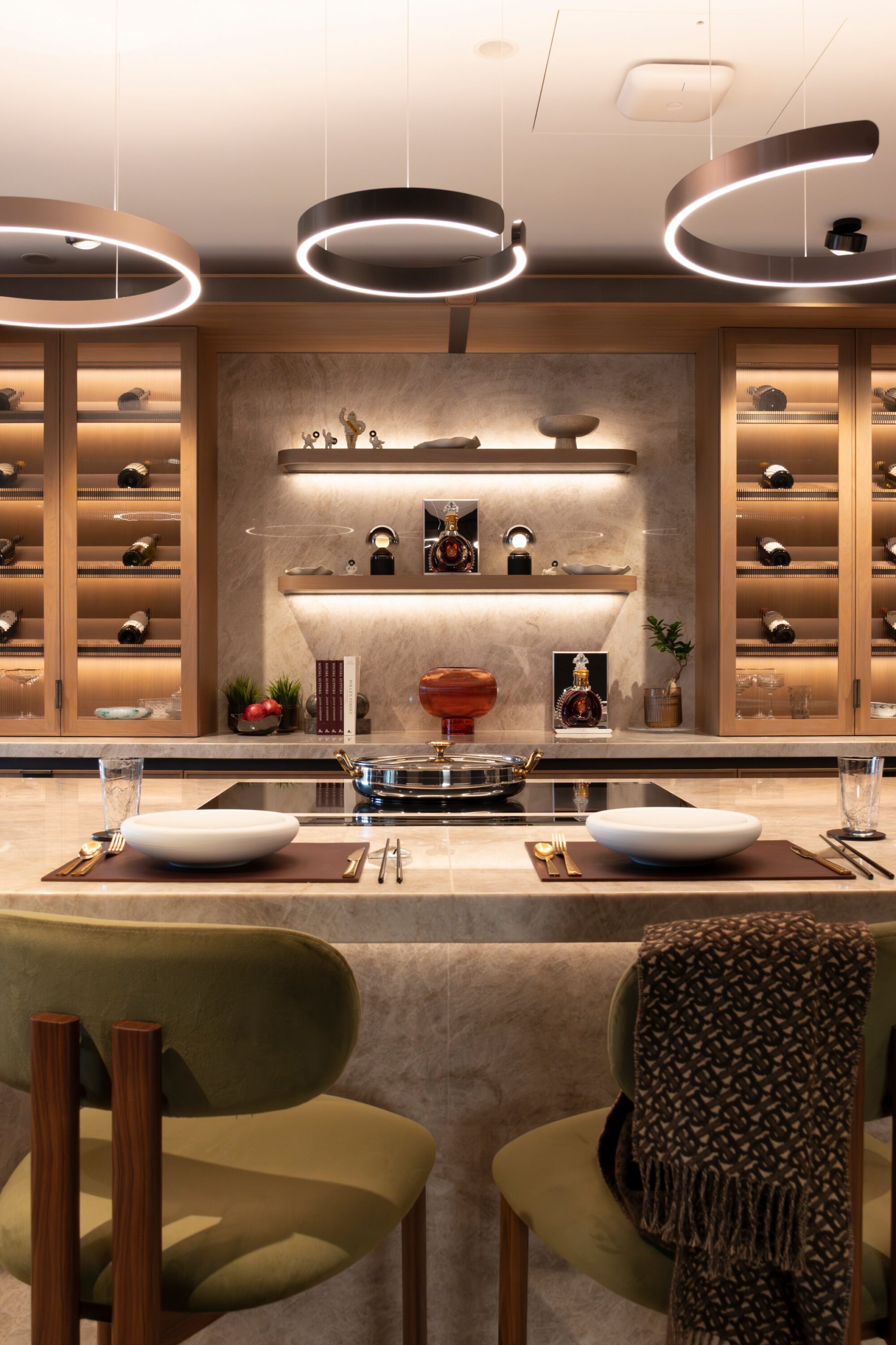At the heart of the space, the central island, topped with a striking Taj Mahal stone worktop flows seamlessly into an integrated dining area, its sculptural curvature echoed in every detail. Suspended above, a statement display provides both elegance and functionality, ensuring the home chef has every essential within reach.