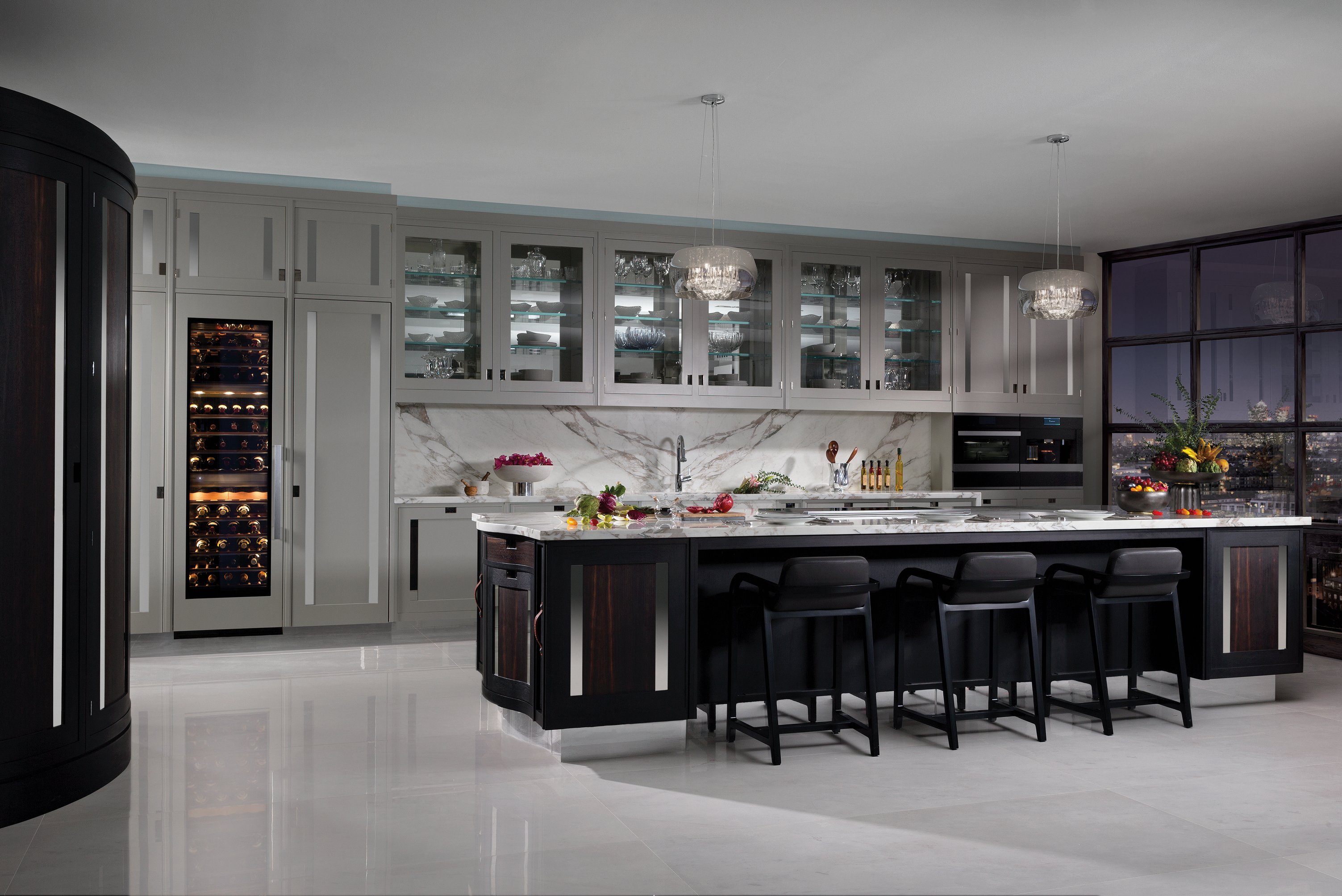 Individually crafted by Smallbone in custom-engraved nickel, pull handles are elegantly recessed into doors and drawers so as not to distract from the luxurious veneer panels and polished to complement the mirror accents throughout the design.