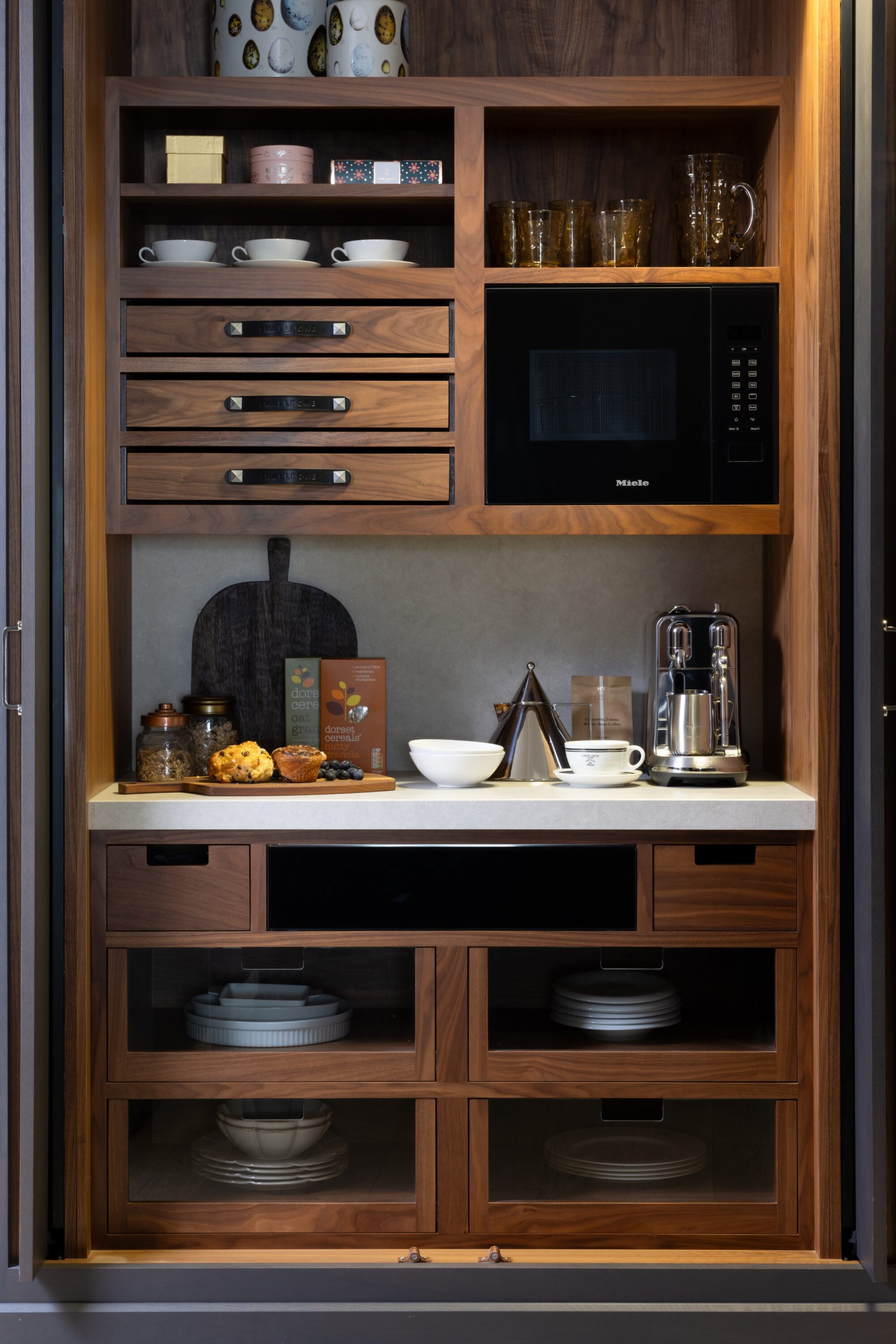 Expansive breakfast larders, handcrafted knife blocks and bespoke inserts for storing cutlery and crockery lined with faux ostrich leather are just some of the luxurious storage options, while exposed metal baskets for fruit and vegetables mirror the industrial aesthetic of Mulberry.